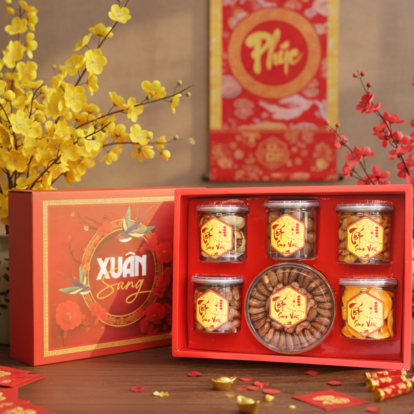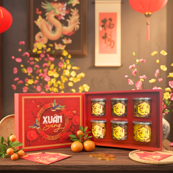Tất cả được đóng gói trong hộp quà sang trọng, mang sắc xuân và ý nghĩa may mắn cho năm mới.